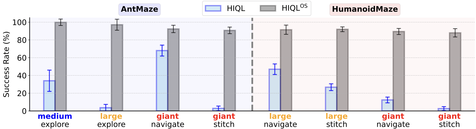 We evaluate HIQL by varying only the high-level policy while keeping the low-level policy fixed. Using learned high-level policy, performance drops, whereas using the oracle high-level policy achieves high success rates, indicating the high-level policy is the main bottleneck.